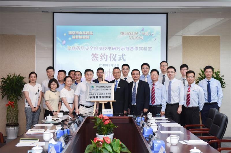 8 月 14日,南京市食药检院与安捷伦科技有限公司在南京签署战略合作协议,共同建立“食品药品安全检测技术研究示范合作实验室”。食药检院杨军院长、凌睿副院长及相关部门负责人,安捷伦公司全球副总裁兼实验室解决方案大中华区总经理陈亮、大中华东大区整机销售总经理杨挺及相关部门负责人共同出席了签约与揭牌仪式。