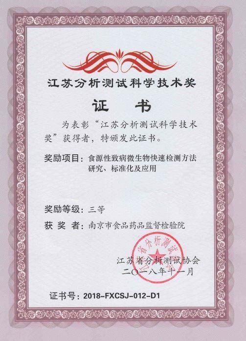 近日,江苏省分析测试协会召开会议,颁发了2017-2018年度江苏省分析测试科学技术奖,市食药检院申报的《粮谷及其加工品中真菌毒素的高通量快速检测方法研究、污染调查及应用示范》和《食源性致病微生物快速检测方法研究、标准化及应用》两项科技成果分别获得二等奖和三等奖。